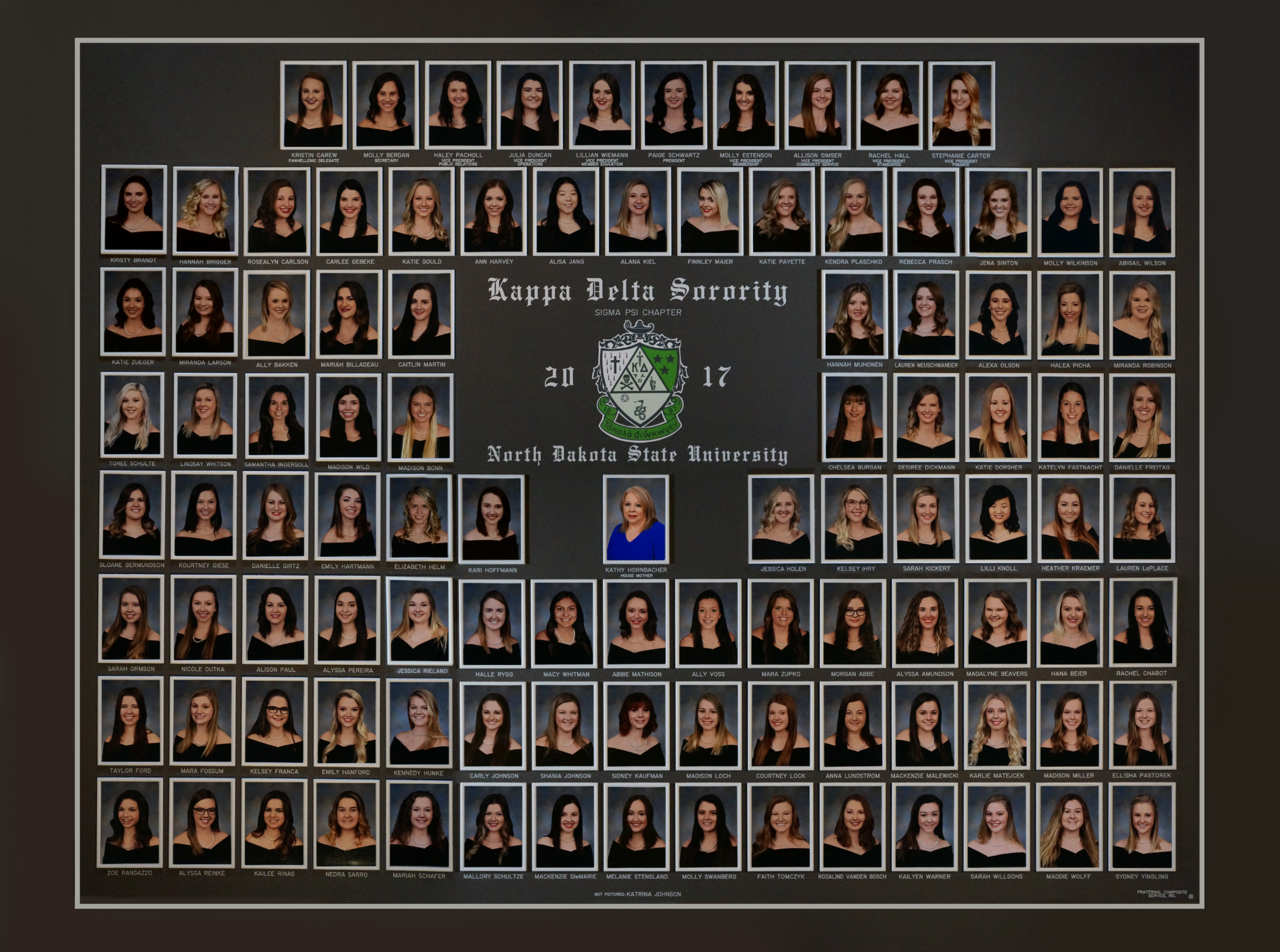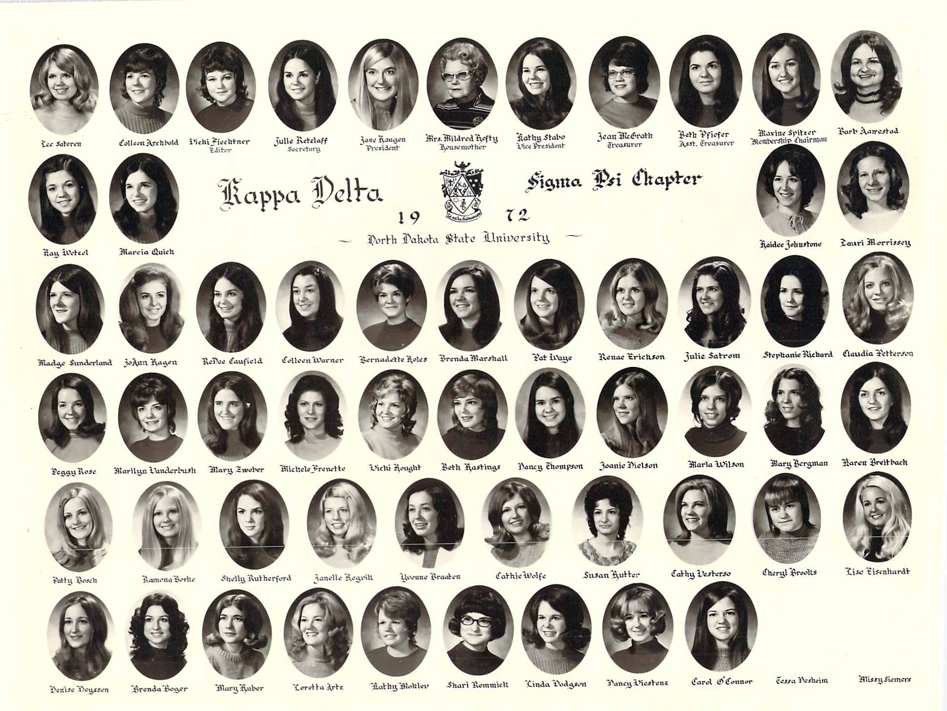 The charter for Sigma Psi Chapter of Kappa Delta was granted on May 3, 1924 on the campus of North Dakota Agricultural College (now NDSU) in Fargo, ND. Kappa Delta became the first national sorority at NDAC. There were 19 installation initiates.